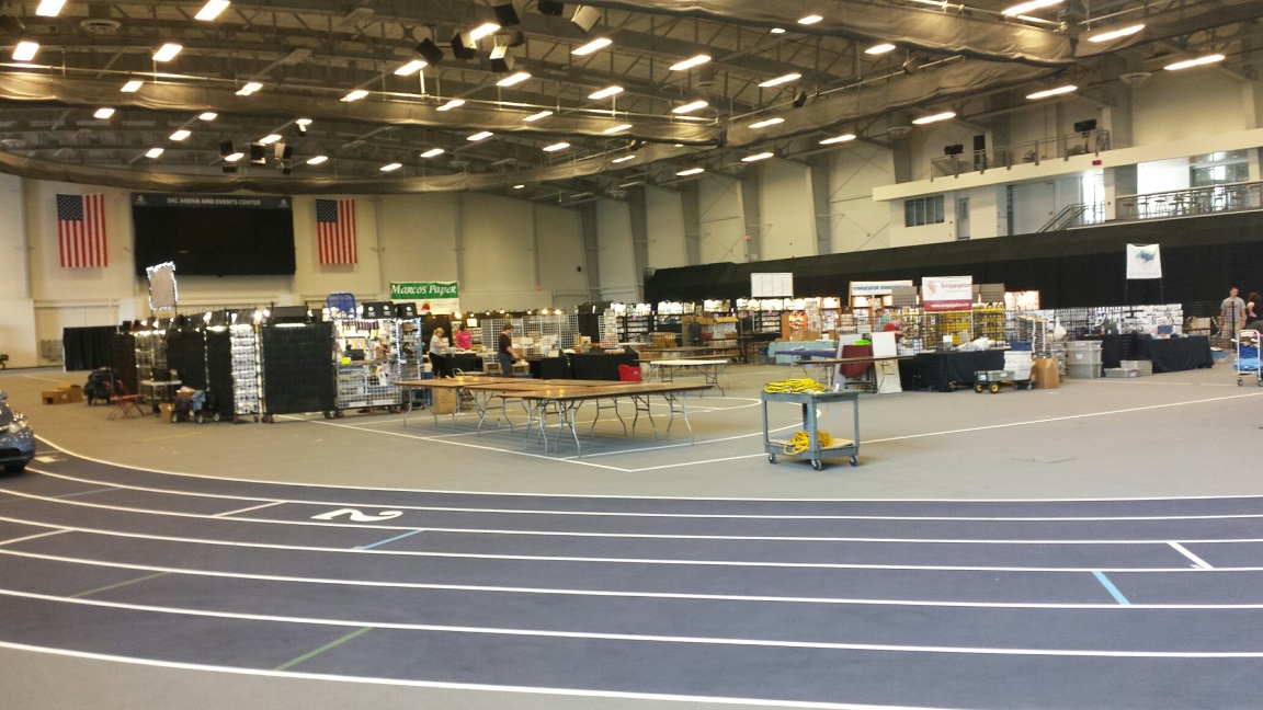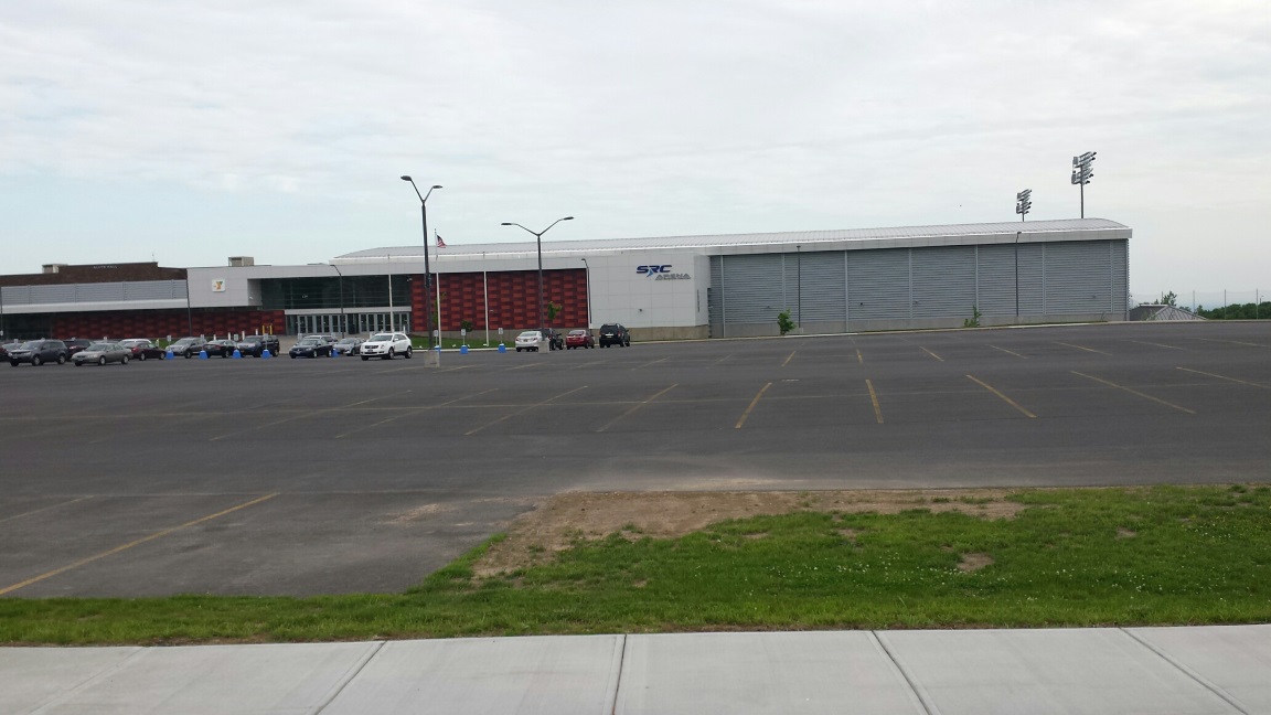 This is a long shot from the road at SRC Arena on the campus of Onondaga Community College. This place is really nice – the whole campus is really nice and is now referred to as “Harvard on the Hill” (there really is a nice view from the back parking lot). But it wasn’t always this way, I’m told – over the past several years, it has been turned from the butt of local jokes into a showplace. It was also the site of “Runapolooza” on Friday while we were setting up our booths.