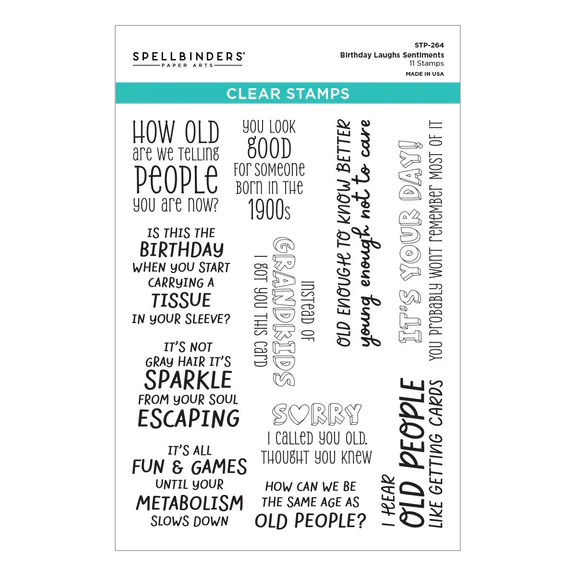 Birthday Laughs Sentiments Clear Stamp Set is part of the Aged to Perfection Collection. The set of 11 sentiment stamps include lots of playful and punny messages perfect for slyly celebrating friends and loved ones. Sentiments include: “How Old Are We Telling People You are Now,” “Is This the Birthday when You Start Carrying a Tissue in Your Sleeve,” “How Can We be the Same Age as Old People,” and “I Hear Old People Like Getting Cards.” The stamps are made in the USA with high-quality polymer for perfect impressions every time. Designed to be used with a clear stamp block.