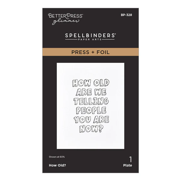 How Old? Press + Foil Plate is part of the Aged to Perfection Collection. Press or foil this plate to print a large and bold sentiment that can be centered on a standard A2-size (4.25 x 5.50 inch) card front or a great quote on a scrapbook page. The sentiment reads: “How Old Are We Telling People You are Now?”