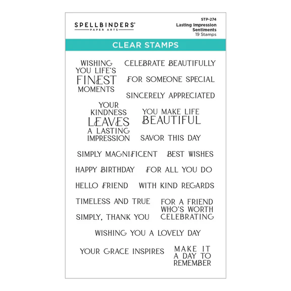 Lasting Impressions Sentiments Clear Stamps is part of the Regal Reflections Collection with 19 clear stamps featuring phrases to celebrate life’s finest moments. Perfect for card fronts or inside sentiments, this 4 x 6″ stamp set includes messages like “Timeless and True,” “Savor This Day,” “Your Kindness Leaves a Lasting Impression” and more.
