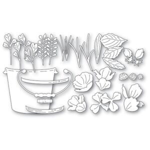 This die measures approximately 2.7 x 2.2 inches pail, 3.3 x 2.9 inches bouquet