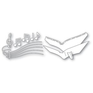 This die measures approximately 3.4 x 1.4 inches book assembled, 0.4 x 1.1 inches treble, 3.1 x 1.3 inches staff, (2) 0.5 x 0.6, 0.4 x 0.6, 0.2 x 0.6 inch notes