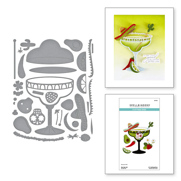 Sip Sip Ole’ Etched Dies are part of the Happier Hour Collection. When assembled, this set of 27 thin metal cutting dies creates festive drinks based on a stemmed wide rim Margarita glass. Details include a line of salt to set on the glass rim and plenty of garnishes to choose from. For extra fun, there are accents to add to set the vibe: sombrero, cactus, sugar skull, strawberry and more! Full of playful margarita puns, BP-337 Sip Sip Ole Sentiments BetterPress Plates. is sure to add the perfect finishing message to your project.