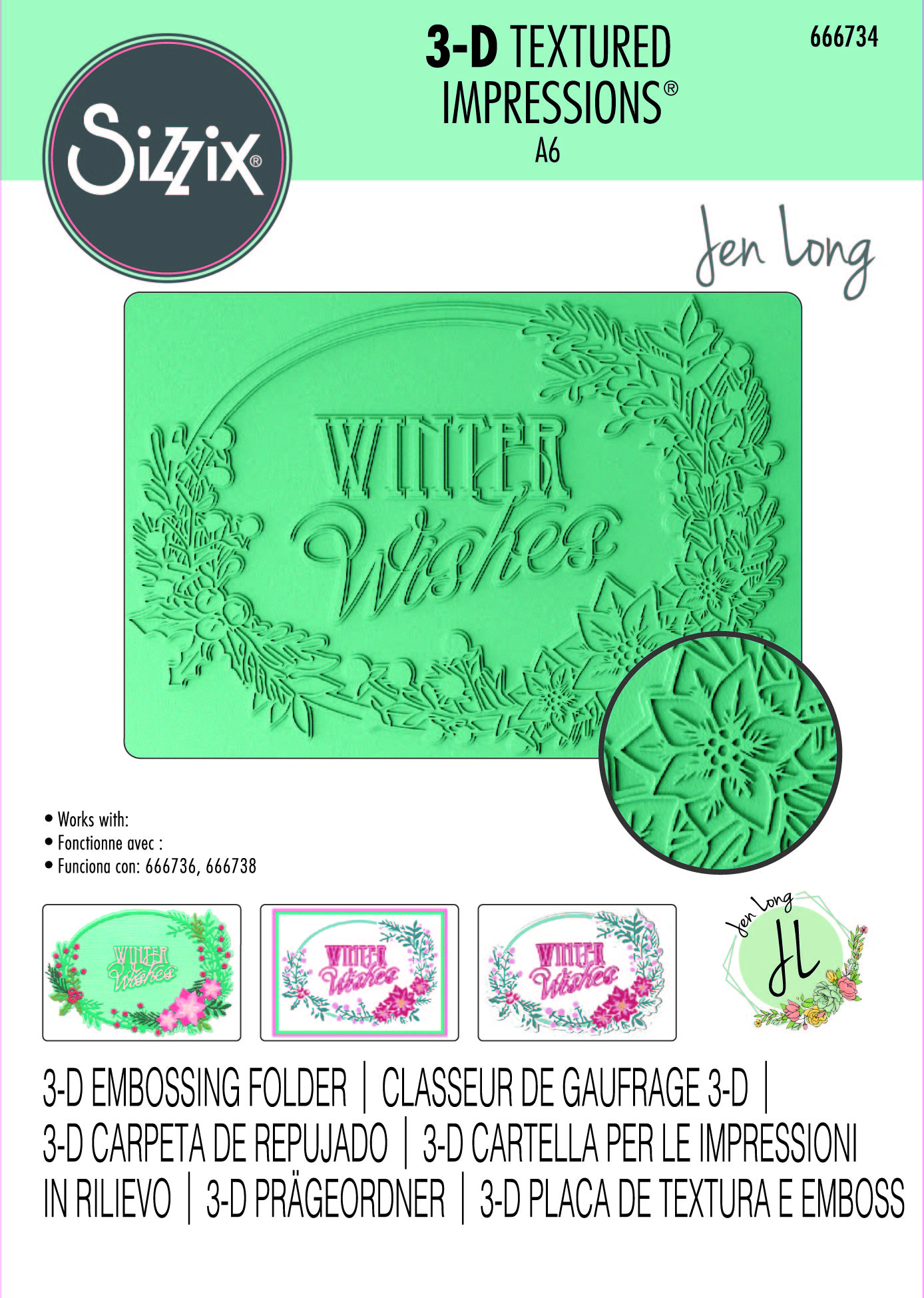 This 3-D Textured Impressions Embossing folder works with Thinlits Die Set 14PK – Winter Wishes #2 (666736) and A6 Layered Stencils 4PK – Winter Wishes #3 (666738). Choose whether to use the different technologies separately for simpler yet effective