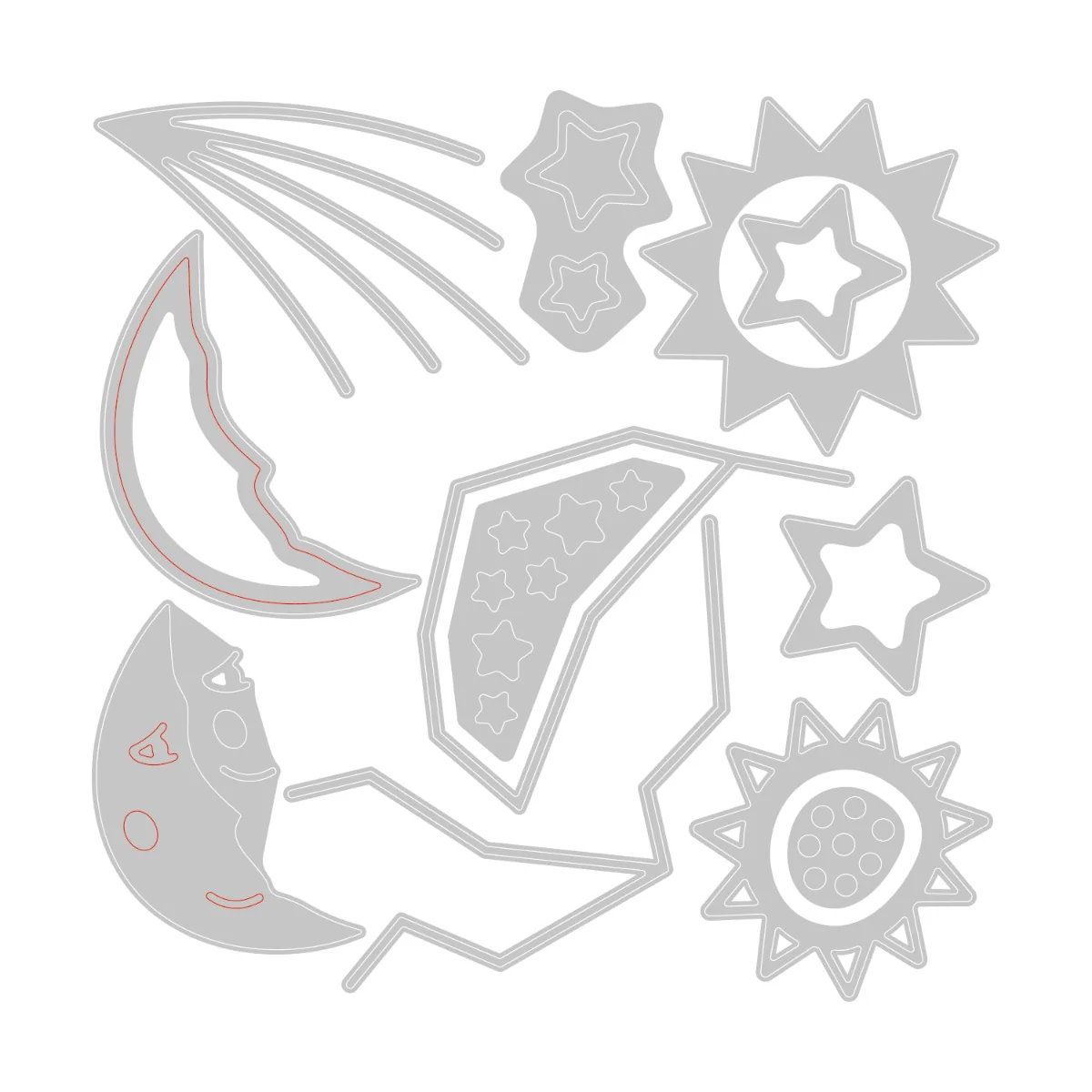 This Sizzix Night Light Thinlits Die Set is perfect for creating a magical celestial scene! Inspired by the space trend, this Thinlits Die Cutting Set by Sizzix Designer Jennifer Ogborn has some gorgeous mix and match elements, including a Moon, Stars, Sun and Constellations perfect for building a scene for nurseries and childrens bedrooms, scrapbooking pages or even a space-inspired card making project. Pair with the Sizzix Muted Collection Cardstock and Sizzix Effectz Embossing Powders to help add that mysterious, intergalactic effect!