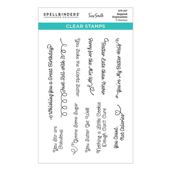 Sugared Expressions Clear Stamp Set is from the Make It & Bake It Collection by Tina Smith. The set of 11 sentiment stamps are rich with adorable, punny sentiments, including: Just Roll with It, “Whisking You a Great Birthday,” “Batter Late than Never,” “You Stir are Fabulous,” and “You Bake the World Batter.” The stamps are made in the USA with high-quality polymer for perfect impressions every time. Designed to be used with a clear stamp block.