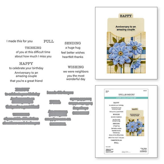 Tabbed In & Out Sentiments Clear Stamp & Die Set is from the Tabbed Classic Collection by Wendy Vecchi and is a set of six clear stamp of words and sentiments with its matching six thin metal cutting dies. Each uppercase “main” words (SENDING, THINKING, HAPPY and WISHING) has supporting sentiments grouped together on a clear stamp. Stamp and then cut them all at once with the matching die for lots of sentiment options. Also, included are the word PULL and the sentiment “I made this for you,” in both stamp and die format. This set works perfectly with S6-260 Essential Envelope Every Day Add-Ons Die Set.