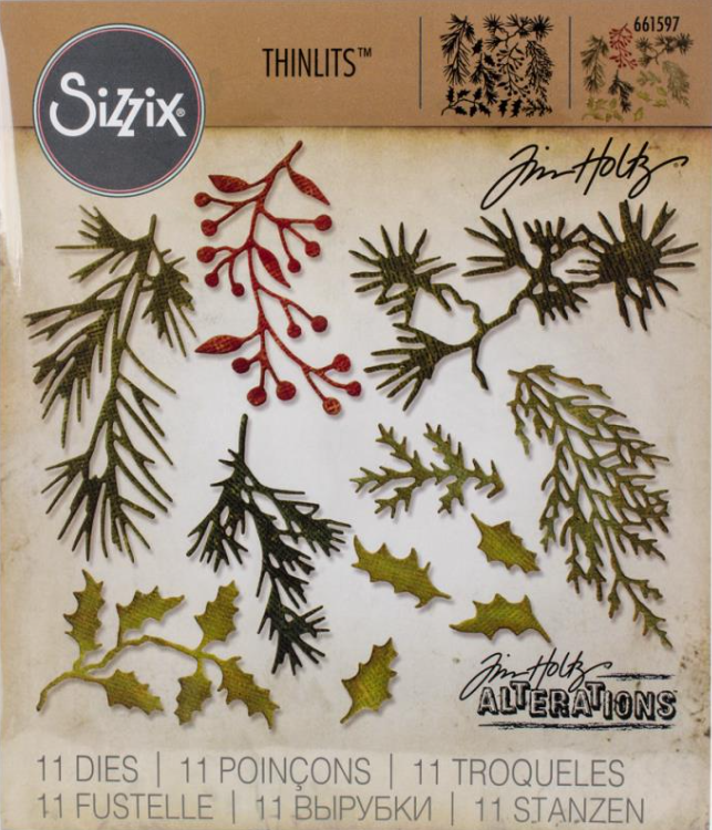 This package contains eleven dies. Design: Mini Holiday Greens (measuring between 3/4×3/8 inches and 3×1-5/8 inches).