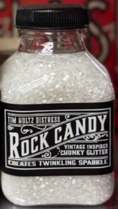 Tim Holtz Distress Rock Candy Glitter is a vintage inspired clear glitter that creates twinkling sparkle. To colorize, add glitter to a cup and add a few drops of Tim Holtz Alcohol Ink. Mix with a craft stick until glitter is colored and desired tint is achieved. Allow glitter to dry. Adhere glitter with Distress Collage Medium, Ranger Glossy Accents or other liquid adhesive.