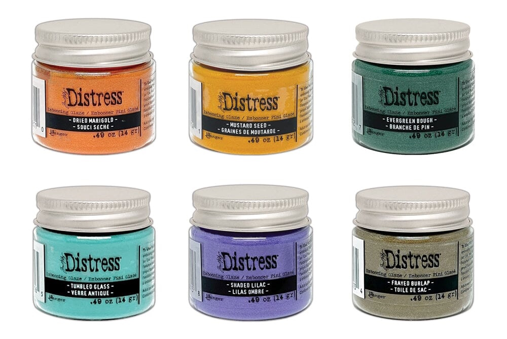 Add dimension to your projects with Tim Holtz Distress® Embossing Glazes! These translucent embossing powders are ideal for layering on surfaces. Use with Distress Embossing Ink Pad, Embossing Dabber, and Embossing Pens. Available in 48 colors.