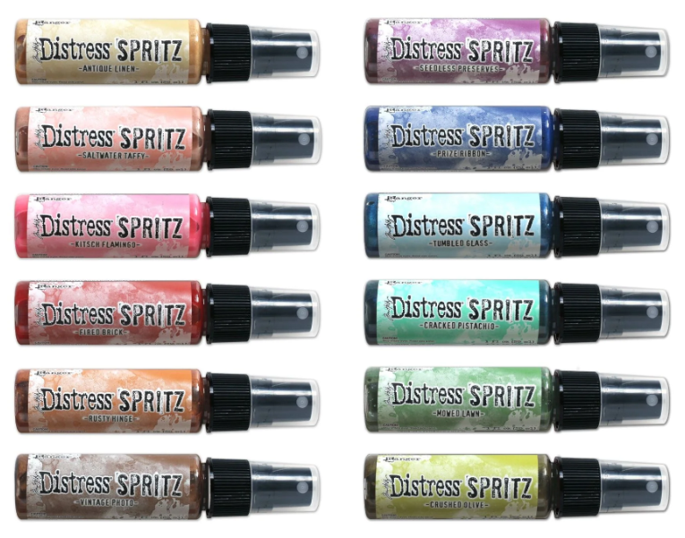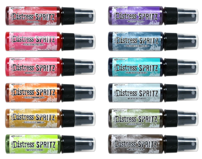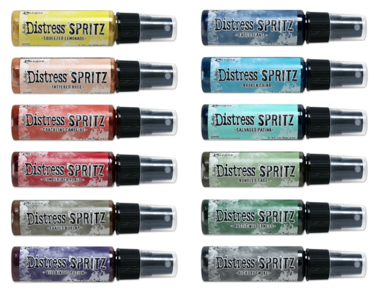 Tim Holtz Distress® Spritz is a luminous spray that coordinates with the Distress color palette to add colorful shimmer to your favorite Distress products.  Each of the 12 new Distress Spritz colors are carefully formulated blends of pearlized pigments in a clear fluid base.  Use on porous surfaces like paper, canvas, wood and more.  Distress Spritz was developed to enhance and work together with other Distress products including Distress Ink, Oxide, Spray Stain, Oxide Spray, Paint, Pencils and Pastes to create colorful, luminous effects and backgrounds.