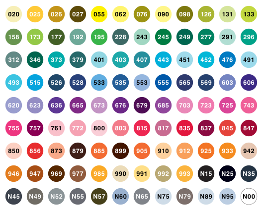 020 Peach, 025 Light Orange, 026 Yellow Gold, 027 Dark Ochre, 055 Process Yellow, 062 Pale Yellow, 076 Green Ochre, 090 Baby Yellow, 098 Avocado, 126 Light Olive, 131 Lemon Lime, 133 Chartreuse, 158 Dark Olive, 173 Willow Green, 177 Dark Jade, 192 Asparagus, 195 Light Green, 228 Gray Green, 243 Mint, 245 Sap Green, 249 Hunter Green, 277 Dark Green, 291 Alice Blue, 296 Green, 312 Holly Green, 346 Sea Green, 373 Sea Blue, 379 Jade Green, 401 Aqua, 403 Bright Blue, 407 Tiki Teal, 443 Turquoise, 451 Sky Blue, 452 Process Blue, 476 Cyan, 491 Glacier Blue, 493 Reflex Blue, 515 Light Blue, 526 True Blue, 528 Navy Blue, 533 Peacock Blue, 535 Cobalt Blue, 553 Mist Purple, 555 Ultramarine, 565 Deep Blue, 569 Jet Blue, 603 Periwinkle, 606 Violet, 620 Lilac, 623 Purple Sage, 636 Imperial Purple, 665 Purple, 673 Orchid, 676 Royal Purple, 679 Dark Plum, 685 Deep Magenta, 703 Pink Rose, 723 Pink, 725 Rhodamine Red, 743 Hot Pink, 755 Rubine Red, 757 Port Red, 761 Carnation, 772 Blush, 800 Baby Pink, 803 Pink Punch, 815 Cherry, 817 Mauve, 835 Persimmon, 837 Wine Red, 845 Carmine, 847 Crimson, 850 Flesh, 856 Chinese Red, 873 Coral, 879 Brown, 885 Warm Red, 899 Redwood, 905 Red, 910 Opal, 912 Pale Cherry, 925 Scarlet, 933 Orange, 942 Tan, 946 Gold Ochre, 947 Burnt Sienna, 969 Chocolate, 977 Saddle Brown, 985 Chrome Yellow, 990 Light Sand, 991 Light Ochre, 992 Sand, 993 Chrome Orange, N00 Colorless Blender, N15 Black, N25 Lamp Black, N35 Cool Gray 12, N45 Cool Gray 10, N49 Warm Gray 8, N52 Cool Gray 8, N55 Cool Gray 7, N57 Warm Gray 5, N60 Cool Gray 6, N65 Cool Gray 5, N75 Cool Gray 3, N79 Warm Gray 2, N89 Warm Gray 1, N95 Cool Gray 1