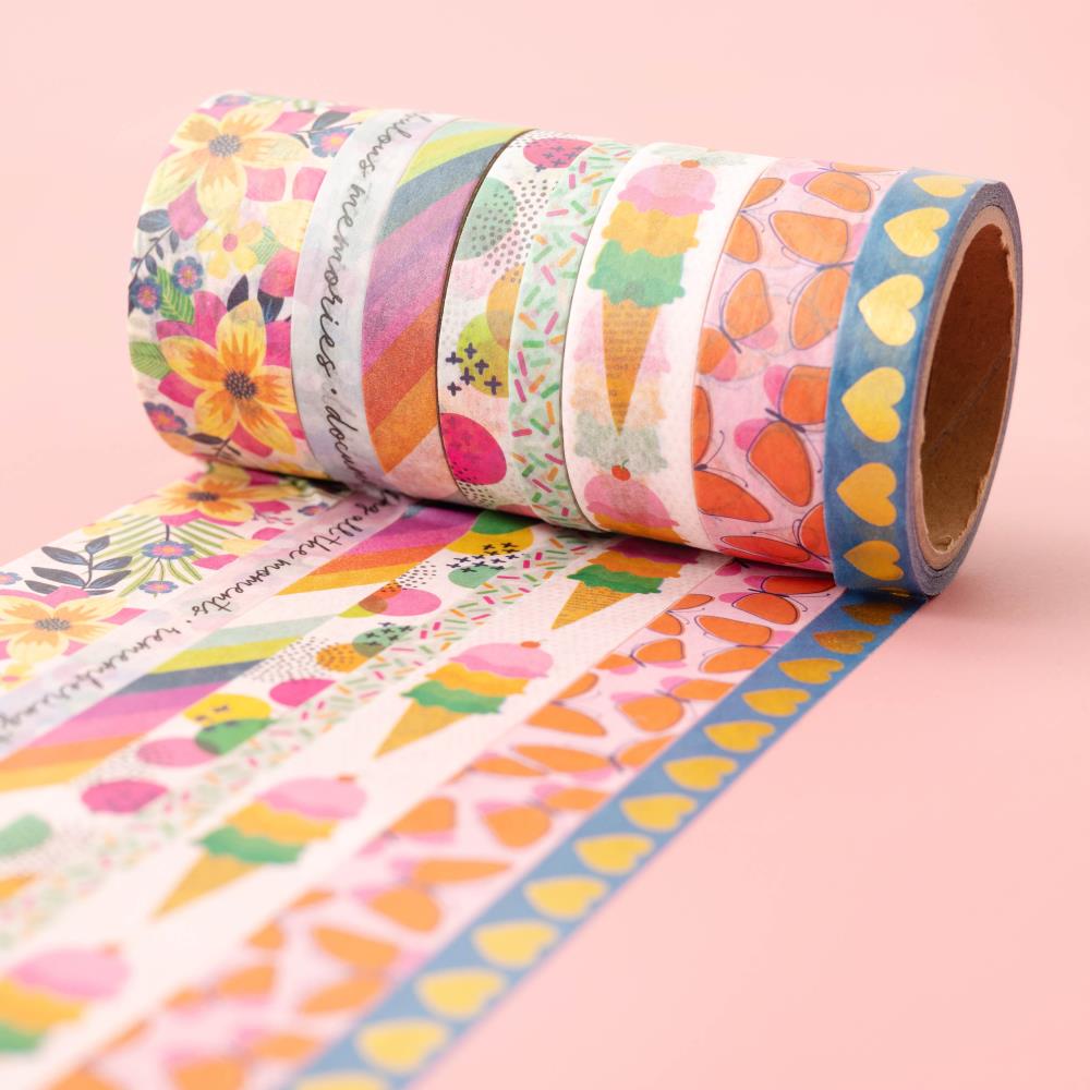 The possibilities are endless with these beautiful washi tape spools from Vicki Boutin! Create custom banners, borders, cards, and other embellishments in no time. This package includes eight rolls of washi tape. Each roll is six yards in length and vary in design and size.